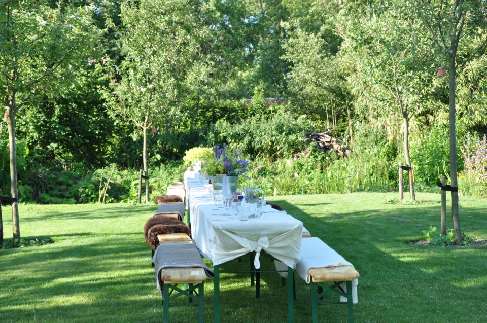 tafel buitenIn de zomermaanden koken wij op het ‘ landje van de boer ‘ met de oogst van t’ land.